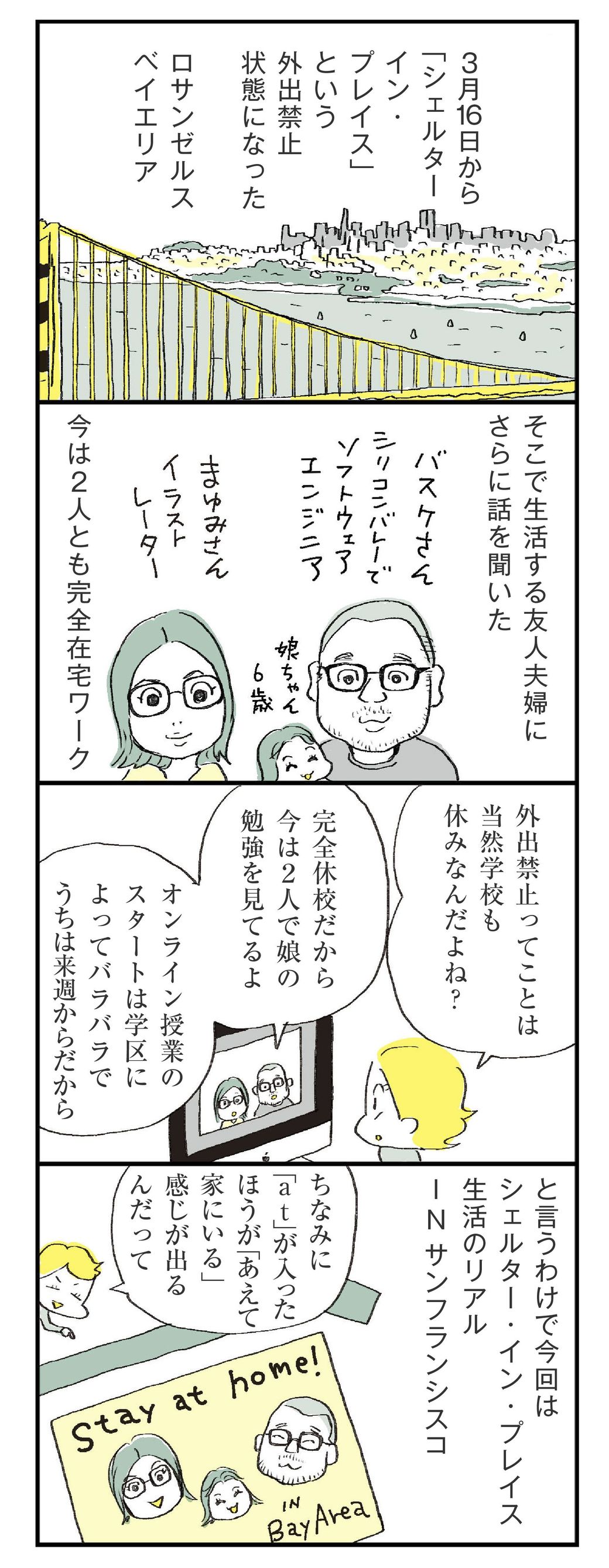 前回から、アメリカ・サンフランシスコのベイエリアに住むある家族の生活を紹介しています。この地域は、かなり早い段階で外出禁止に踏み切り、そのおかげもあってNYと明暗を分けたと言われることもあります。