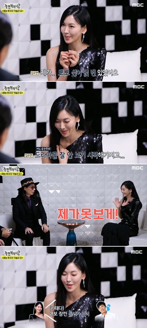 김소연은 "내가 뽀뽀 신이 몇 번 있었다. 그래서 어느 순간부터 드라마를 안 보기 시작해서 좋은 장면들만 내가 추려서 보여줬다"라고 말하며 멋쩍은 미소를 지었다.