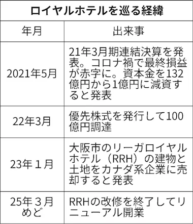 ロイヤルホテルは20日、主力のリーガロイヤルホテル(大阪市)の土地と建物をカナダ系の不動産投資会社に売却すると発表した。土地・建物の売却額は非公表だが、500億円台半ばとみられる。売却後も運営を受託して営業を続ける。不動産投資会社はロイヤルホテルに約3割出資して筆頭株主になる。新型コロナウイルス禍で悪化していた財務体質を改善し、リニューアルして海外富裕層らの取り込みを狙う。