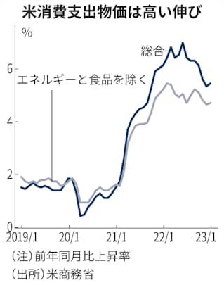 住居費など特定の品目に影響されにくいため、動きはCPIと比べて小さくなりがちだ。前年同月比の上昇率はいずれも22年6月がピークだがCPIの9.1%に対し、PCEは7.0%にとどまっていた。